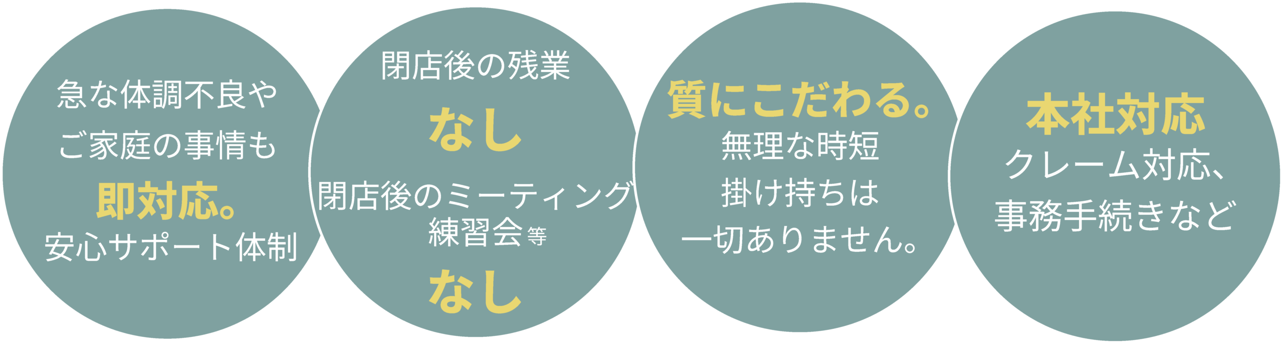 今の職場が合わなかった方、給与が見合わなかった方、働く時間やお休みを柔軟に、ブランクがある方などが、安心して再スタートできる環境を揃えてお待ちしています。