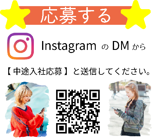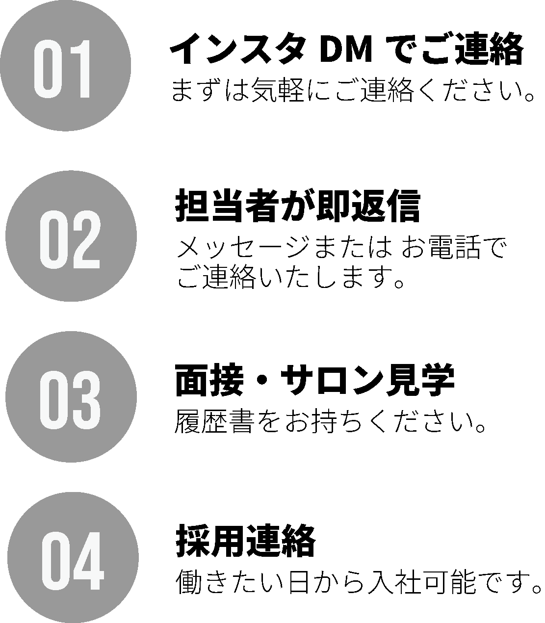 ご応募はインスタグラムで気軽にご連絡ください。メッセージをいただいたら、担当者がすぐに返信し、メッセージ またはお電話でご案内します。その後、面接やサロン見学へ。入社は最短で働き始めたい日からOKです!